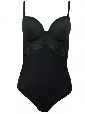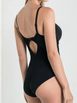Luxusní body z kolekce Ether je novinkou na trhu s prádlem. Podprsenka, která je podepřená kosticí je ze sendvičového materiálu /3D spacer/, má nastavitelná ramínka a zapínání vzadu na jeden háček ve třech polohách. Body je celé ze zdvojeného lehce pružného materiálu a má stahující účinek. Klínek je z bavlny se třemi cvočky. Část pod prsy je ozdobená našitou krajkou. Nohavičky jsou ukončené naplocho takže nejsou viditelné pod oblečením. Ze stejné řady je i podprsenka LUN-14050 a LUN-14051
