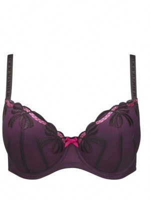 Fialová balkonová podprsenka je pošitá černým tylem a kolem horního okraje košíčků je ozdobená jemnou výšivkou, která dělá z této podprsenky neobyčejně tajuplnou záležitost, která bude patřit k zádumčivému podzimu svým tajuplným vzezřením. Je lehounce vyztužená, nastavitelná ramínka mají uprostřed malinký kanýrek. Zapínání je vzadu na dva háčky ve třech polohách.