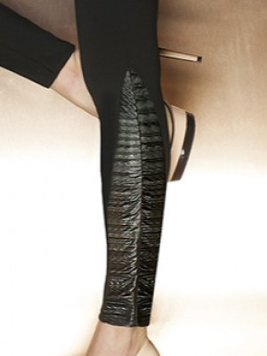 Luxusní leginy, které už spíš připomínají kalhotky, Zadní díl je do sedla, kapsy na předním dílu jsou jen v náznaku, na dolním konci nohavic jsou klínky z umělé kůže. Stejný motiv se opakuje na místě falešných kapes. Délka je 91 cm, šířka nohavice je 12 cm, pásek nahoře s gumou uvnitř je široký 5 cm.