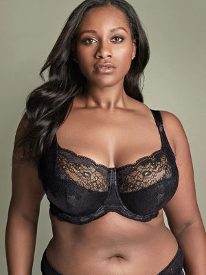 Excelentně padnoucí právě na hodně velká prsa je tato podprsenka, jež je důmylsně vyrobená ze dvou prolínajících se materiálů. Základní pevnější část je doplněna jemnou tělovou krajkou. Výsledkem je lehká, měkkoučká podprsenka podepřená kosticí a s nastavitelnými sametem podšitými ramínky. Ve výstřihu je neviditelná, neboť v horní části je ukončená elastickou krajkou.