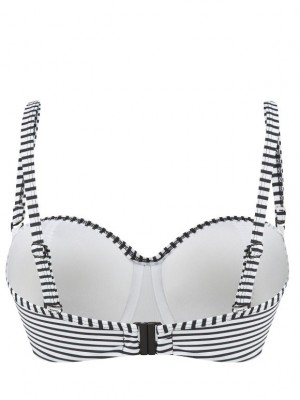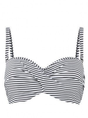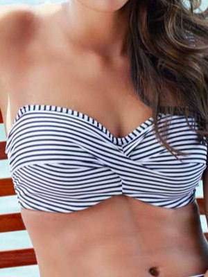 Plavky pro moderní ženu - stále aktální proužek, tentokrát v černo-bílé kombinaci s twist efektem (překřížení). Košíčky jsou vyrobené tak, že opravdu i při velkých velikostech prsou, drží na svém místě a kostice obepíbající prsa nedovolí, aby se sesmekly.