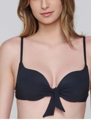 Hladká push up podprsenka s nastavitelnými ramínky a zapínáním na zlatý úzký háček znamená klasiku a volbu pro ženy s malými a ještě menšími prsy. Je lehounká - mezi košíčky ozdoba ve formě uzlu.