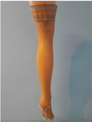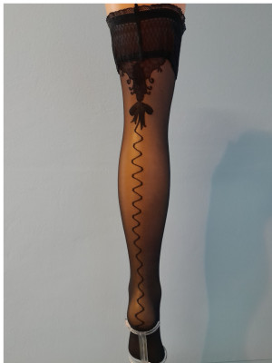 Luxusní samodržící punčochy je v zadní části opatřen krásnou výšivkou, z níž je dolu spuštěný cik cak šev. Špička není zesílená, vrchní zesílený okraj je opatřený třemi pruhy kvalitního silikonu, který zajišťuje, že se punčocha při pohybu neposunuje směrem dolů.