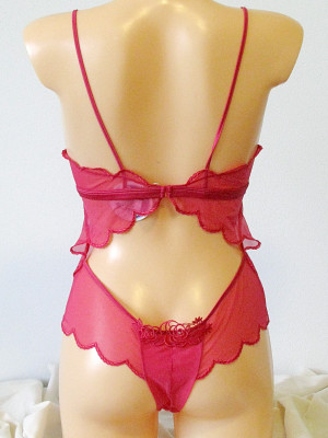 Nádherné sexy body je celé z poloprůsvitného elastického tylu a zdobené je hojně plastickou výšivkou. Krásně pošité je i prázdný kruh na zádech. Zde je umístěno i zapínání jako na podprsence. Zapínání v klínku je na tři cvočky.