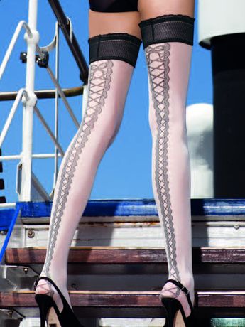Luxusní samodržící punčochy mají v zadní částí místo švu od vrchní části zužující se šněrování tak, že u paty je nejužší.