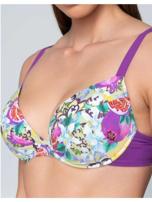 Nádherný opravdu letní vzor na této lehce vyztužené podprsence má nízký střed což sbližuje prsa k sobě. Boční díly stejně tak jako ramínka jsou jednobarevné, zapínání na kovový klip